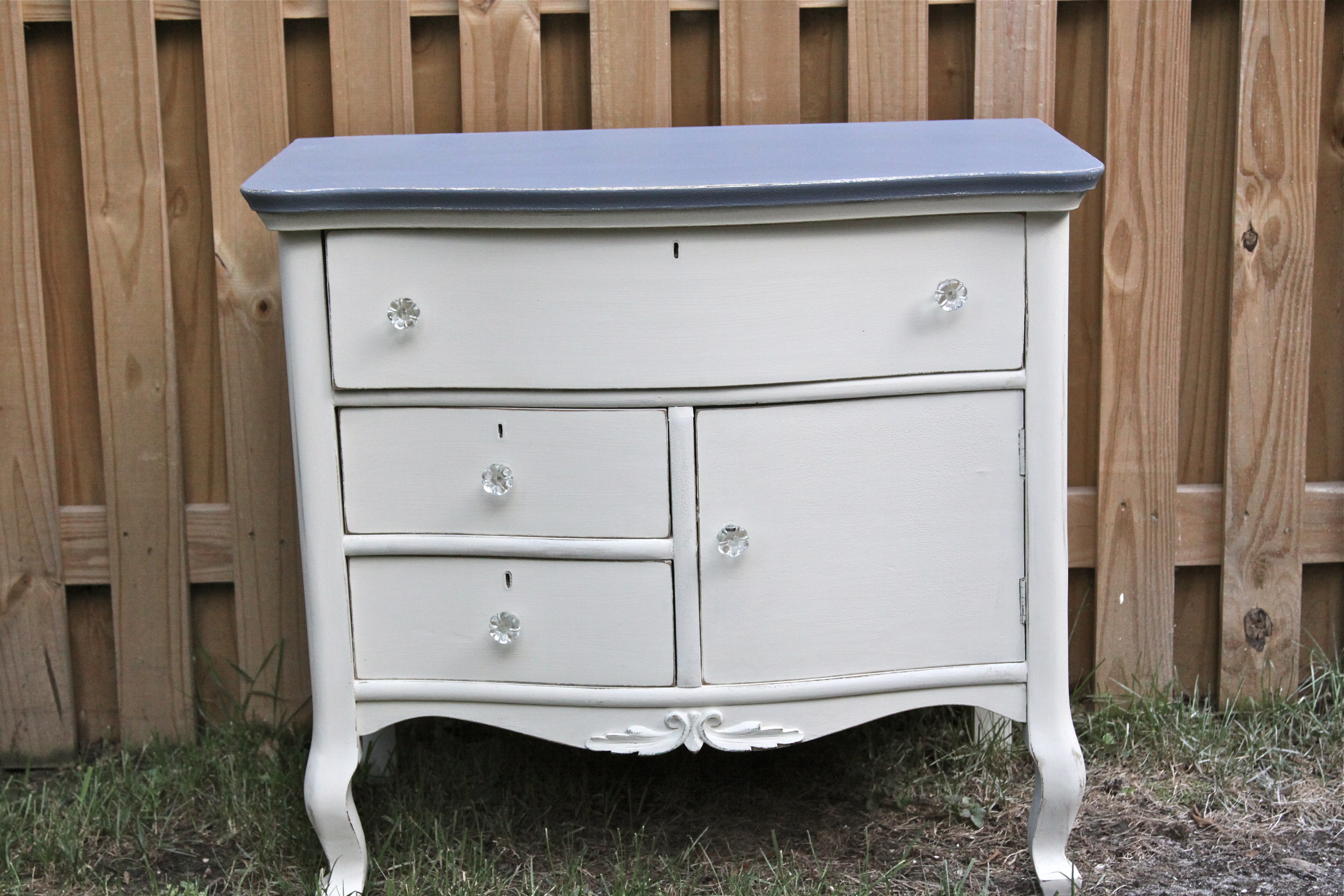 Here is a little project I just finished. This I did with Annie Sloan Old White and Old Violet. I just love this color combo. This little items could be used as a night stand, a TV stand or even in a living room. I just adore it! Her stats are — 32″wide 20″deep 29″tall. I think I’ll call her Violet:-) Violet has brand new glass knobs as well. She is now looking for a new home. She is $145.