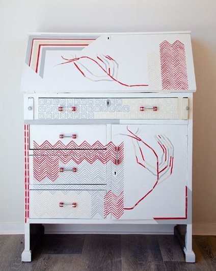 Over the Art Deco design, Jeanie used a little bit of Olive, English Yellow, and Old White to give a copper look. Once dry she took sandpaper to the tall desk to distress it slightly. Distressing is one of my favorite things to do when I create DIYs. Distressing adds an old vintage look to any piece of furniture.