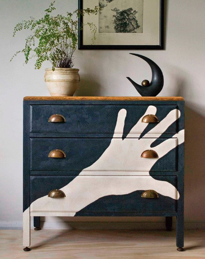 Jeanie painted the desk first with Chalk Paint® in Graphite to act as a dark, blank canvas and drew her dramatic design on top with a pencil. Next, Jeannie painted the design using Chalk Paint® in Old White and Florence, mixed with a dash of English Yellow.