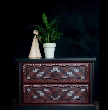 The piece was finished in all colors of Chalk Paint Wax® by Annie Sloan; first, a coat of Chalk Paint Clear Wax was used, then Chalk Paint Dark Wax on the green sections of the bureau, followed by a mix of White and Black Wax on the darker grey sections. The whole piece was finished again in Clear Wax to protect it from any damages!