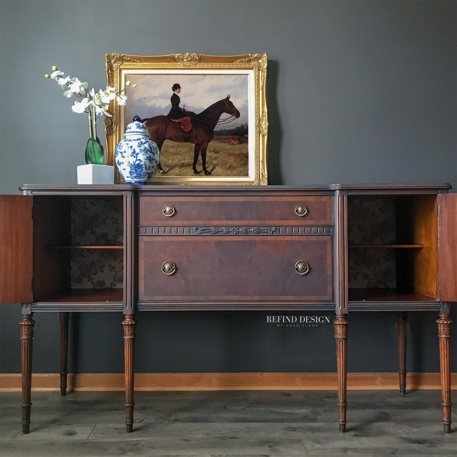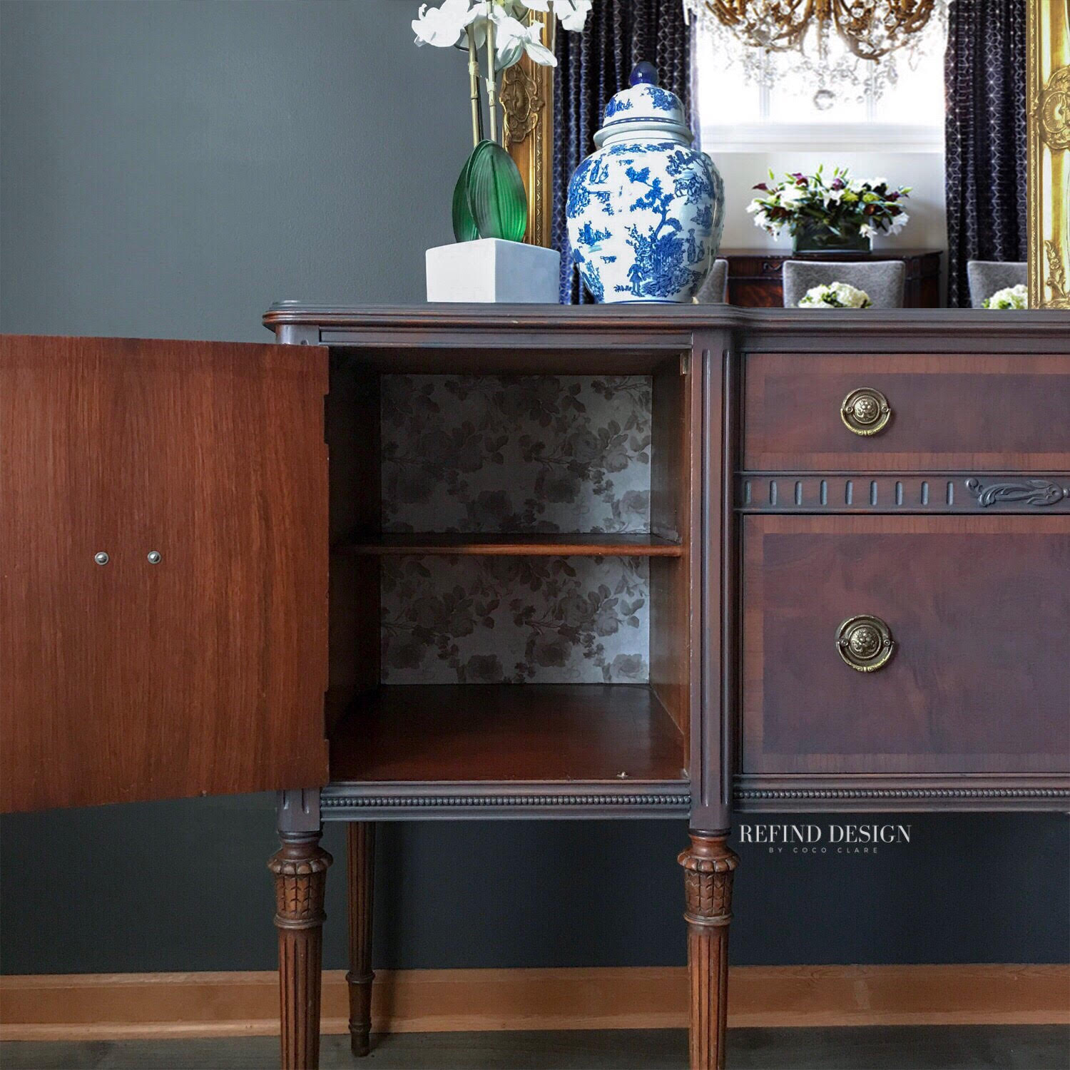 Jilian started with this beautiful piece, but transformed it to modernize it and enhance its vintage beauty. To create this stunning, and super on-trend, two-tone beauty and breathe new life into this buffet, Jilian used a mix of General Finishes products. To start, she applied a thin application of Queestown Gray Milk Paint to create a “time-worn” effect and create the illusion of a stain. For the cabinets and legs, she mixed General finishes stains in Antique Oak and Black Cherry. She lined the back of the cabinets and drawers with a gorgeous floral wall paper to finish it off. We love the finished product, don’t you?!