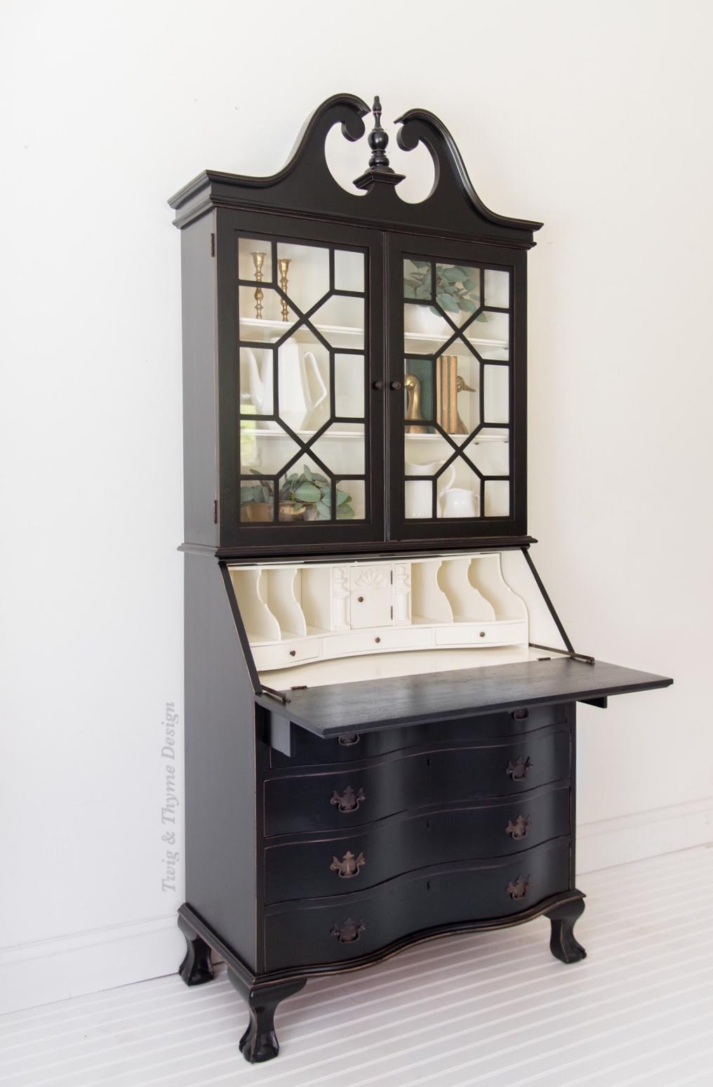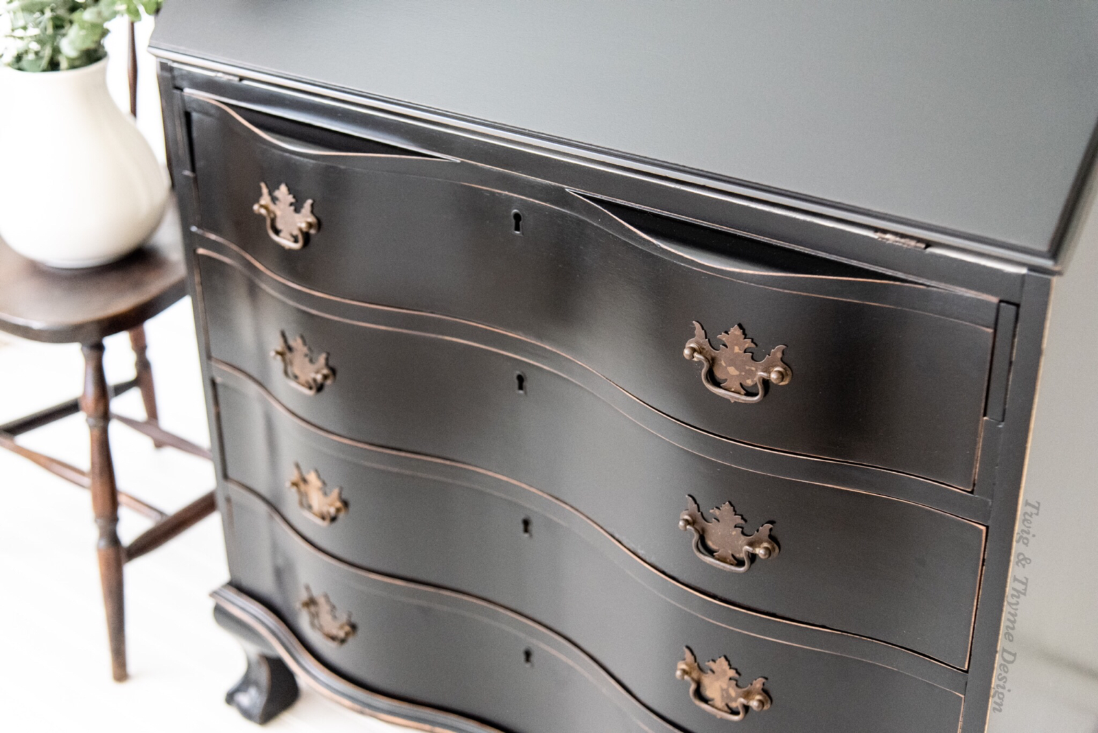 To achieve this polished look, Courtney applied layers of General Finishes’ Enduro Black Poly on the exterior, following each coat with a light sand to help achieve this flawless finish. The inside of the pieces was primed with the General Finishes Stain Blocker (which is a great way to prevent bleed through from stains!) and painted with General Finishes Milk Paint in Antique White. To help maintain the classic look of the piece, they left the original hardware and lightly distressed along the edges to highlight some of the lines and details. The final step was applying a layer of the General Finishes Enduro Lacquer for an added bit of protection!
