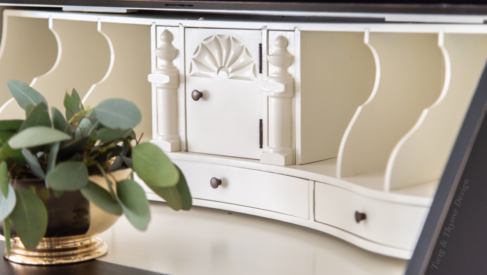 This gorgeous drop front secretary was made in 1937 and had been passed down for three generations. So naturally, it had seen its fair share of wear and tear and was a great candidate for a full makeover. Courtney was commissioned by her client to refresh this piece, while still maintaining a more classic look. The first step was a pretty extensive cleaning to remove the built up grime and worn finish. She sanded down some surface imperfections and repaired the drawers, tip trim, and foot to make sure the piece was ready for painting!