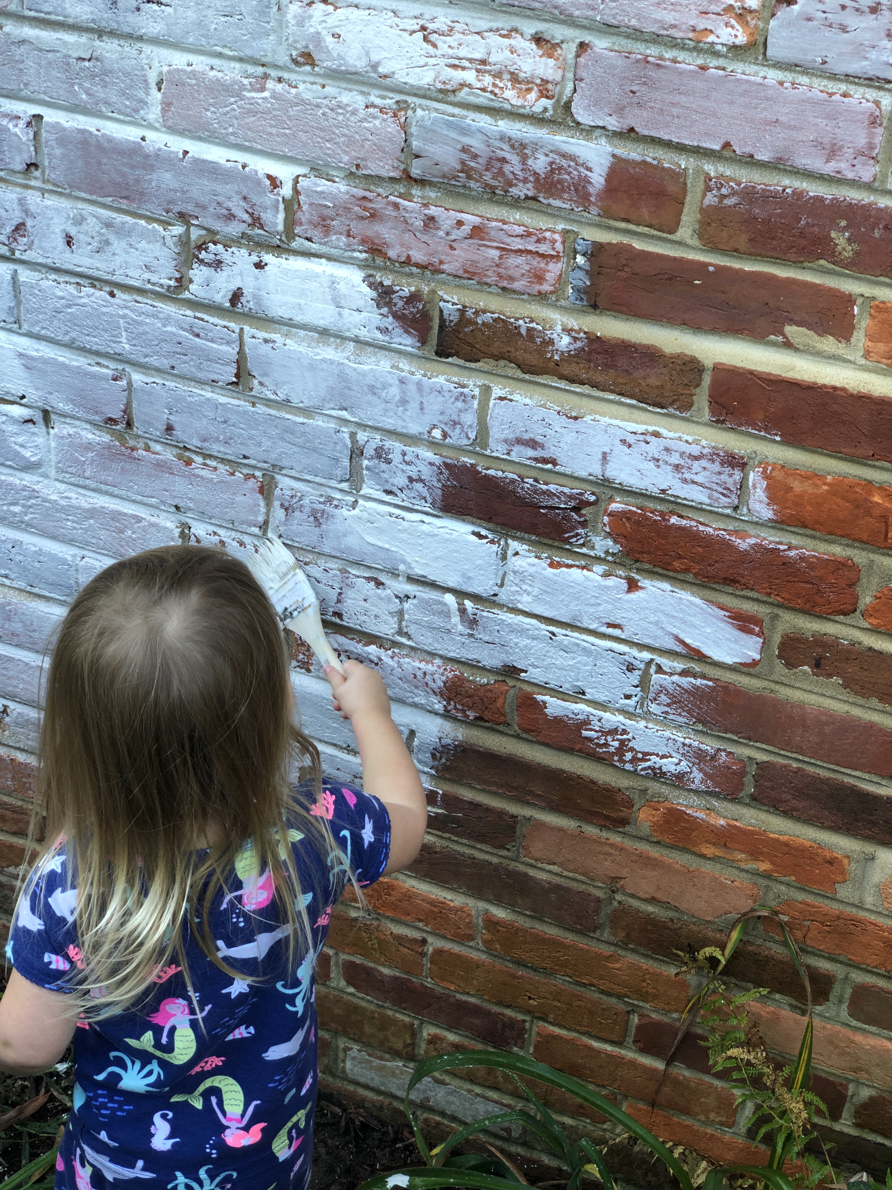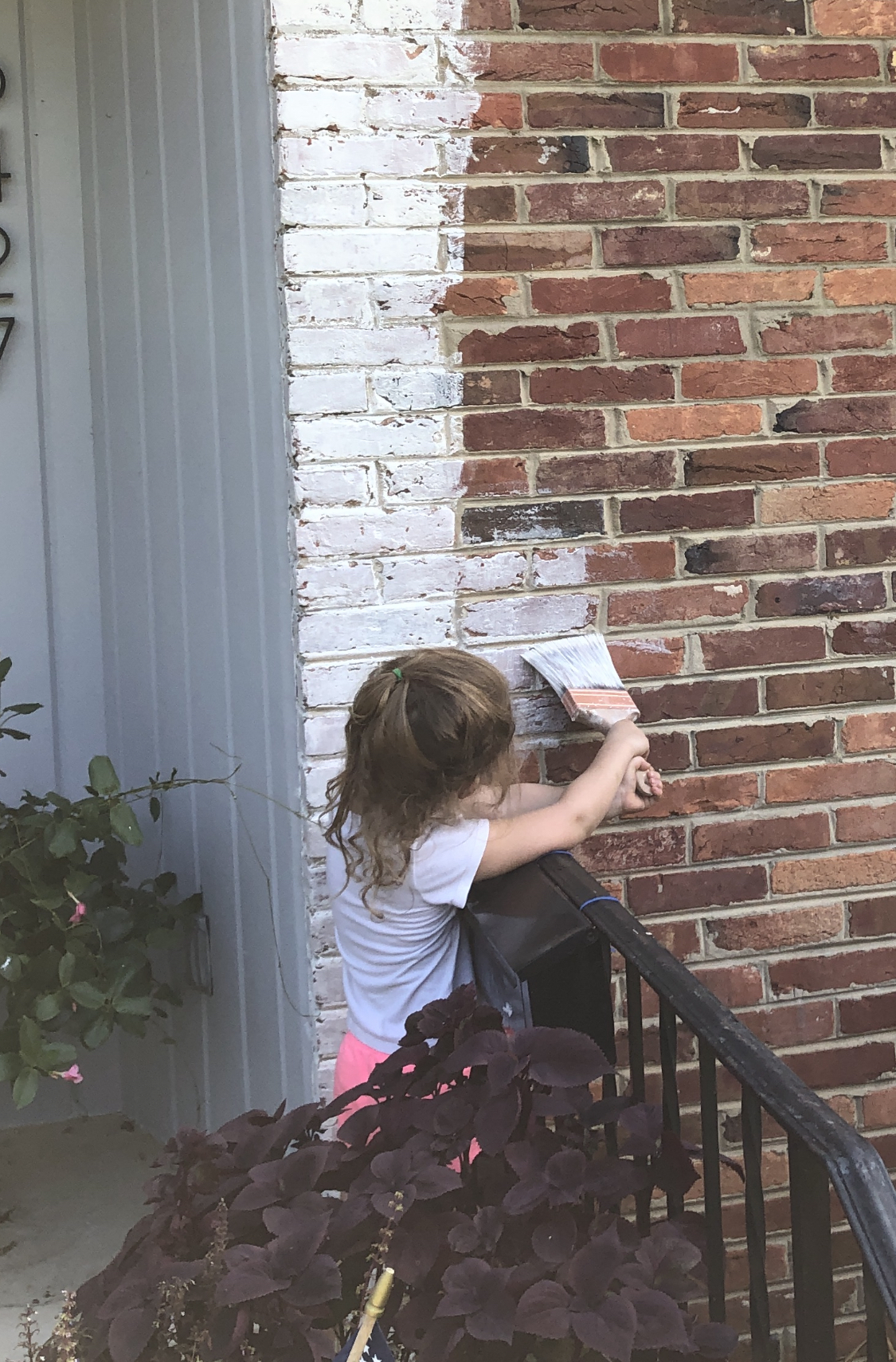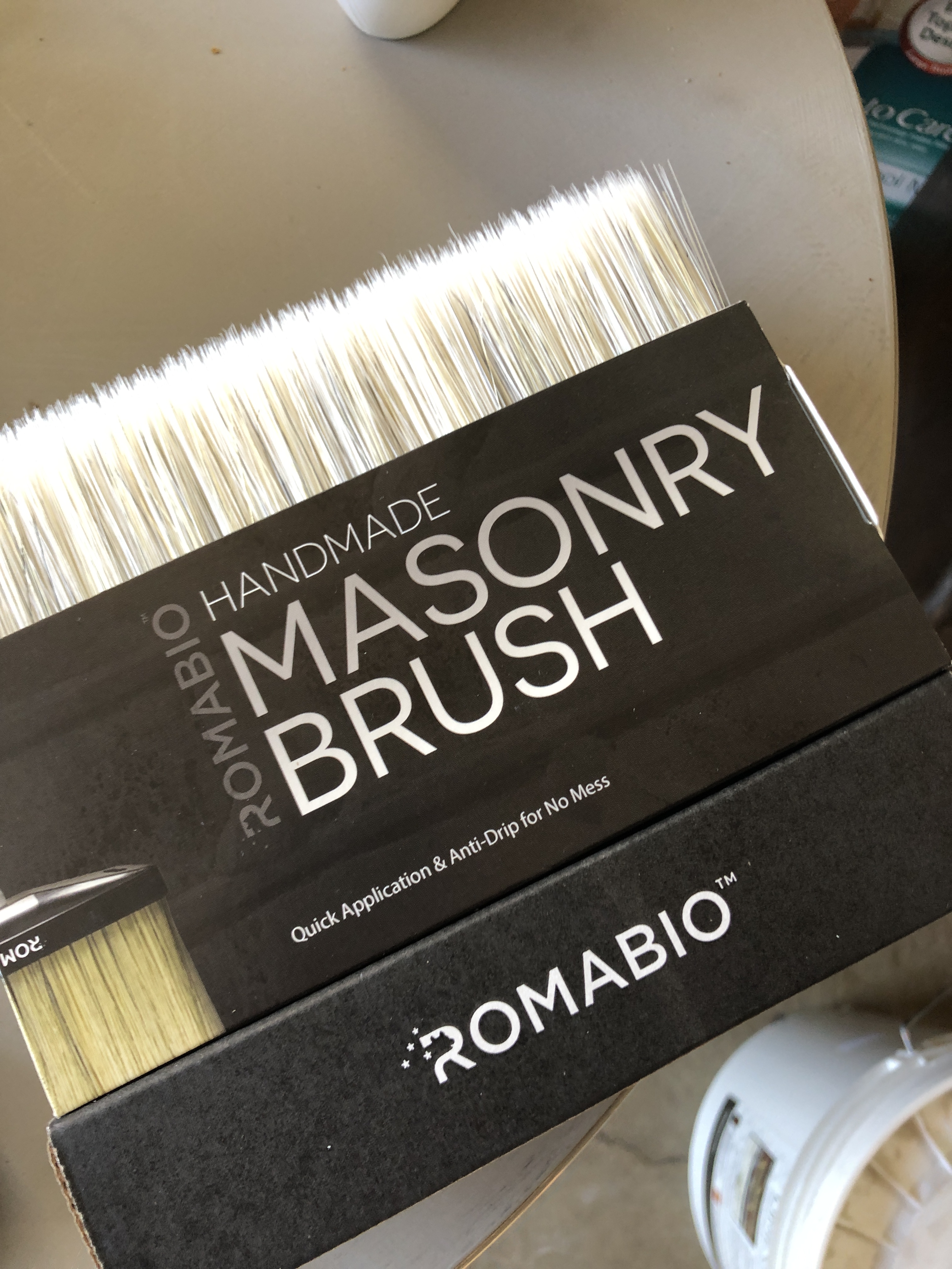 So how did this happen? Well I googled the paint that the YHL folks used and found out you could buy the Lime wash at Home Depot …so then I had my handy hubby pick up a sample to “test”. I started the test on this run down brick fire pit in the back yard…then I moved to the side of the house…then I got brave and moved to the FRONT of the house….at some point there was just no turning back. We are still working on the sides and back of the house.