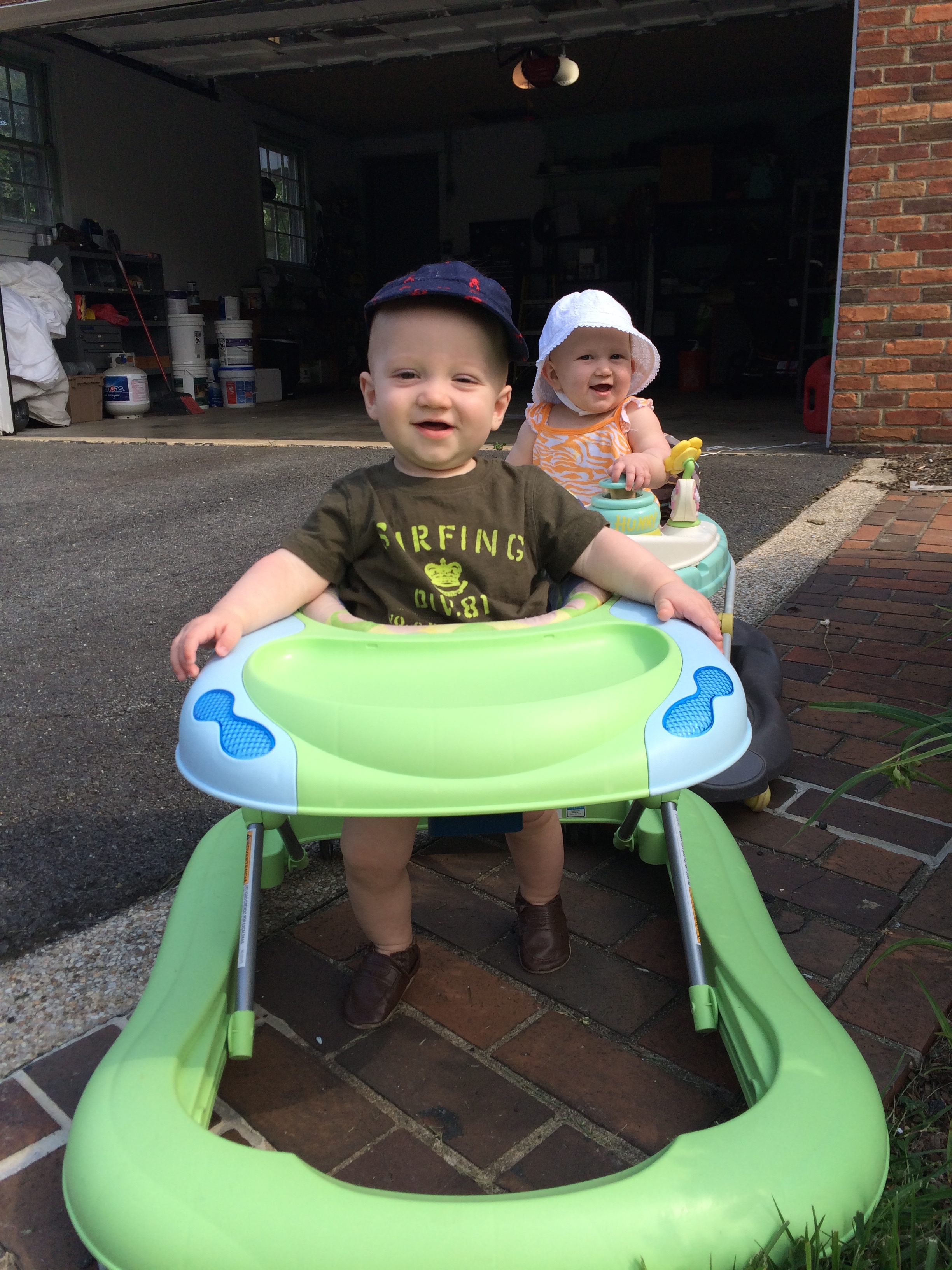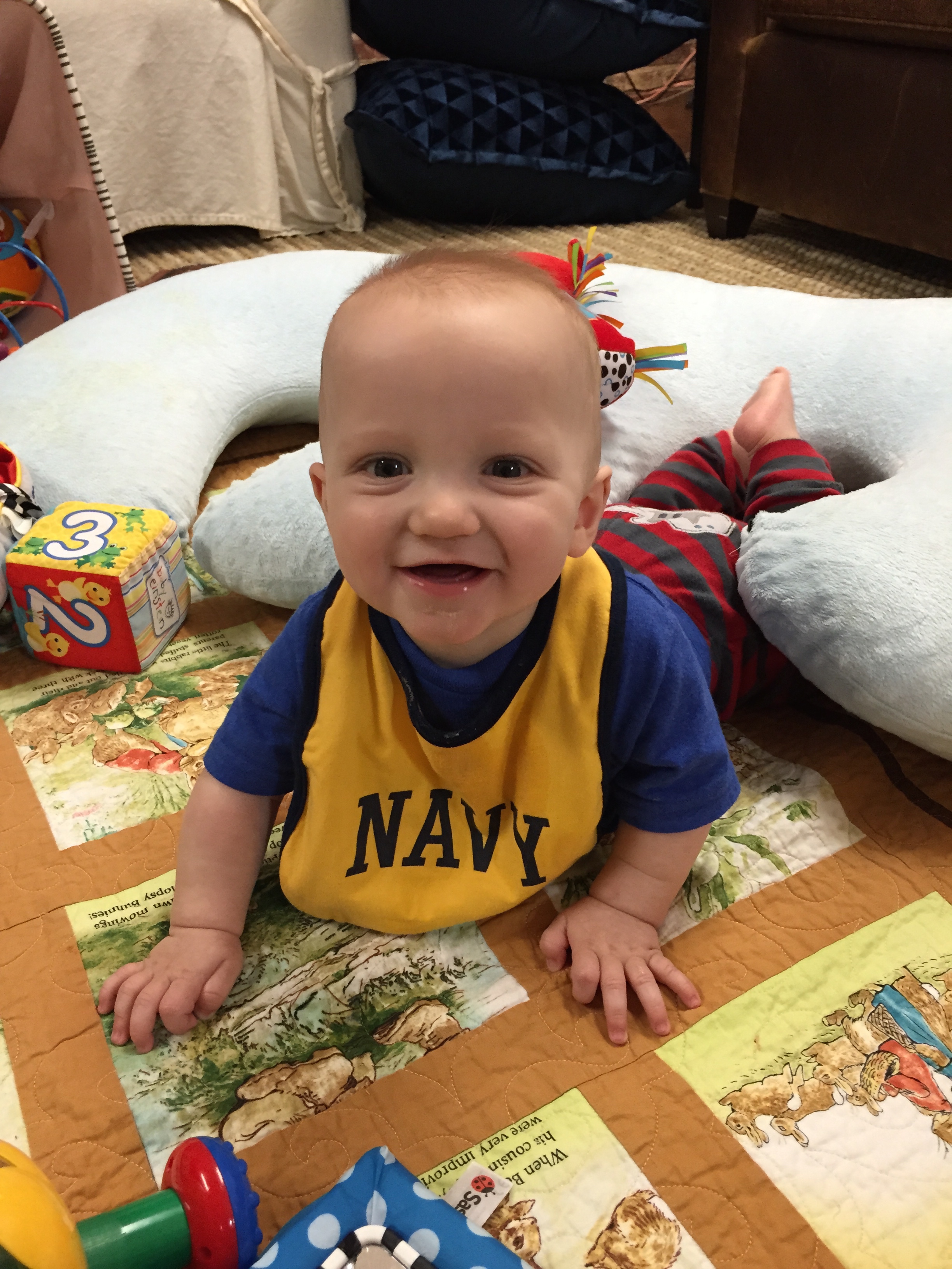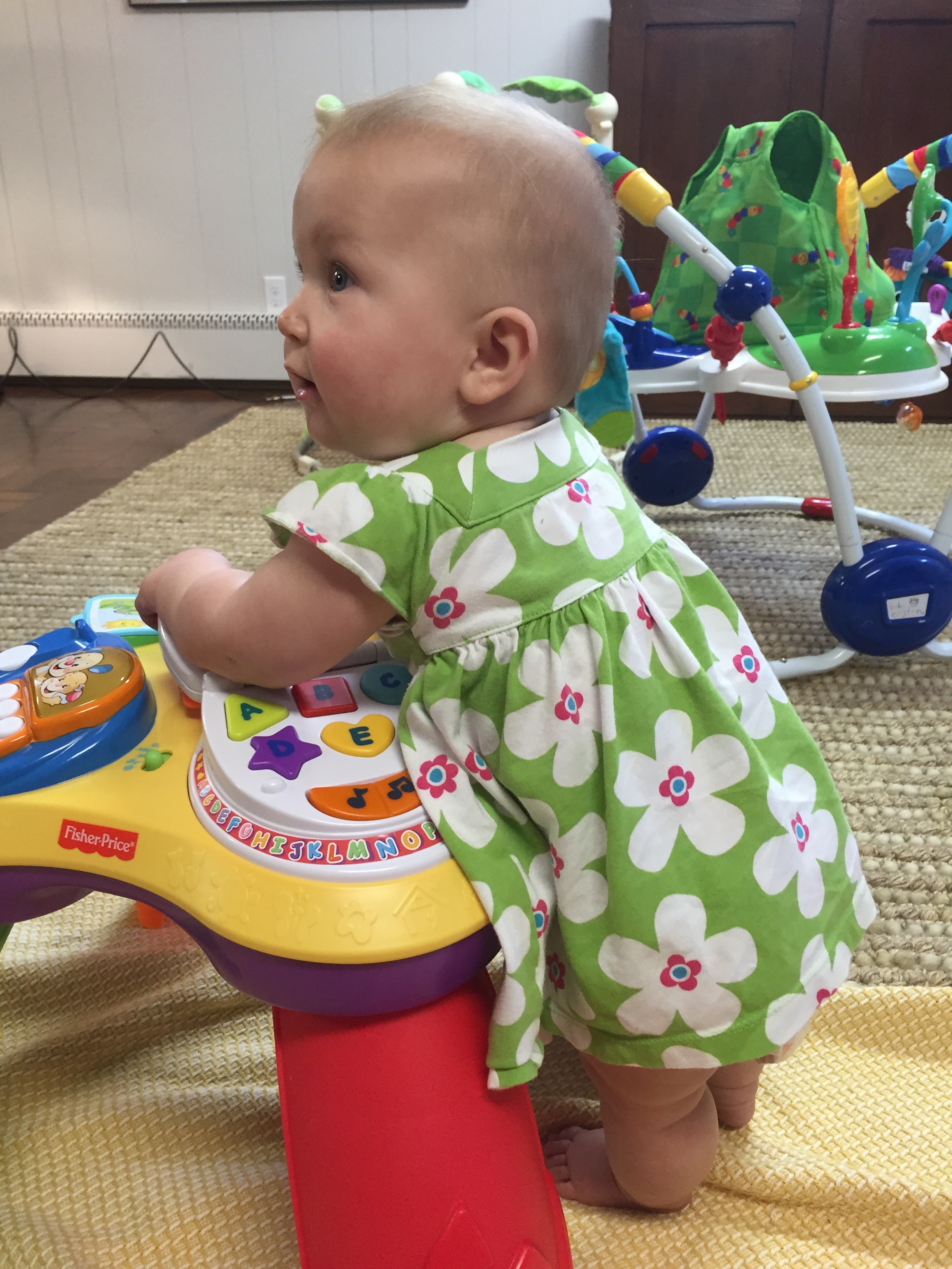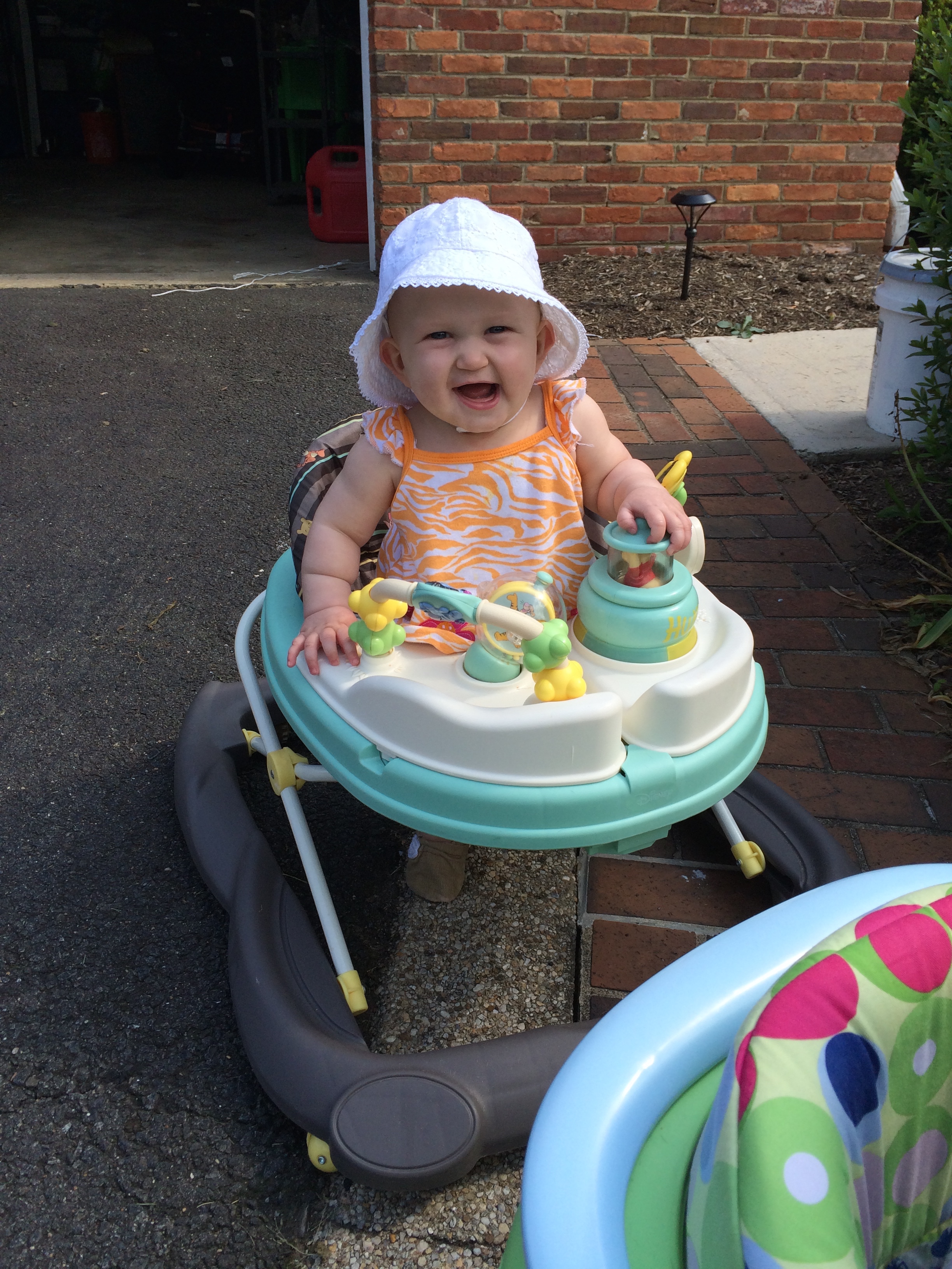 Liam is getting HUGE he started out smaller than his sissy (as we call her or Miss P) and we called him Benjamin Button for a while because he came out looking like an old man. His other nick name was grumpy gus…now a days he is a chunky monkey and happy little guy. Most days his sister is running all over him LITERALLY and he is happy to chill out and take in the scenery. His favorite things these days are: 1) solid food doesn’t matter what he loves to eat! 2) music 3) his sissy he loves to give her kisses as she is running over him 4) the dogs he enjoys chasing hem around the house in the “car” (walker) 5) and his momma he will be my boy for sure! 6) his “car” the walker. 7) Mickey Mouse Club. Here are a few recent pictures of him…