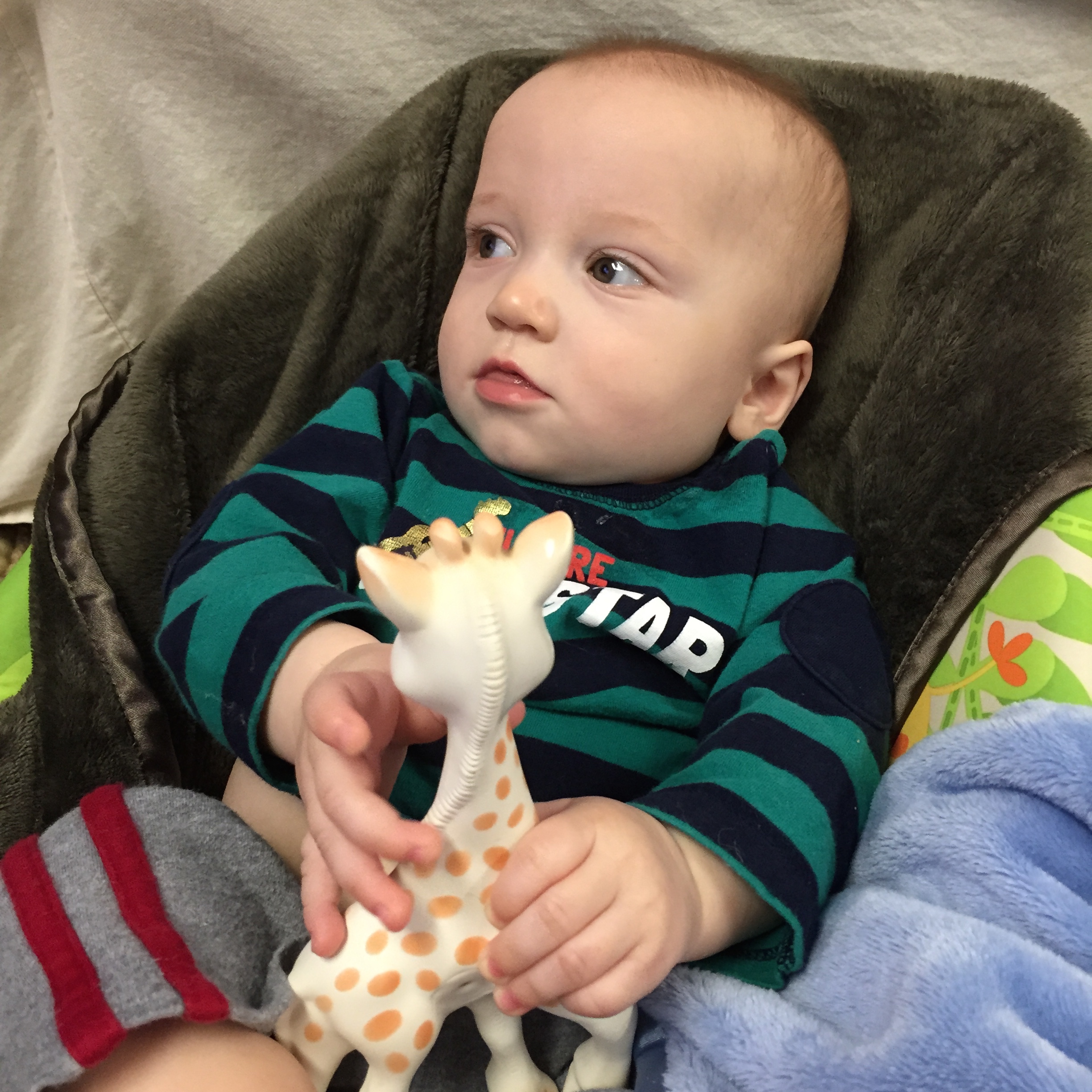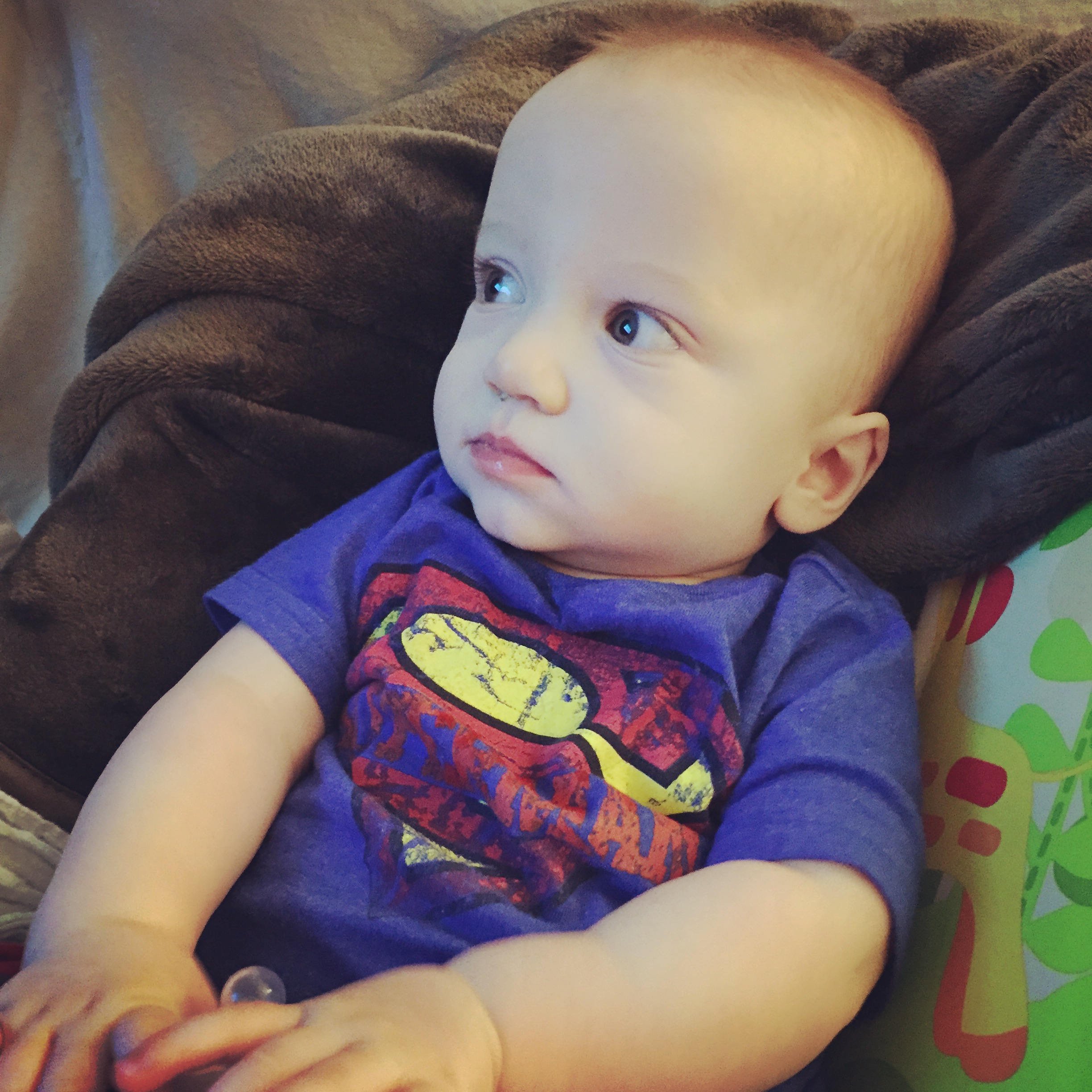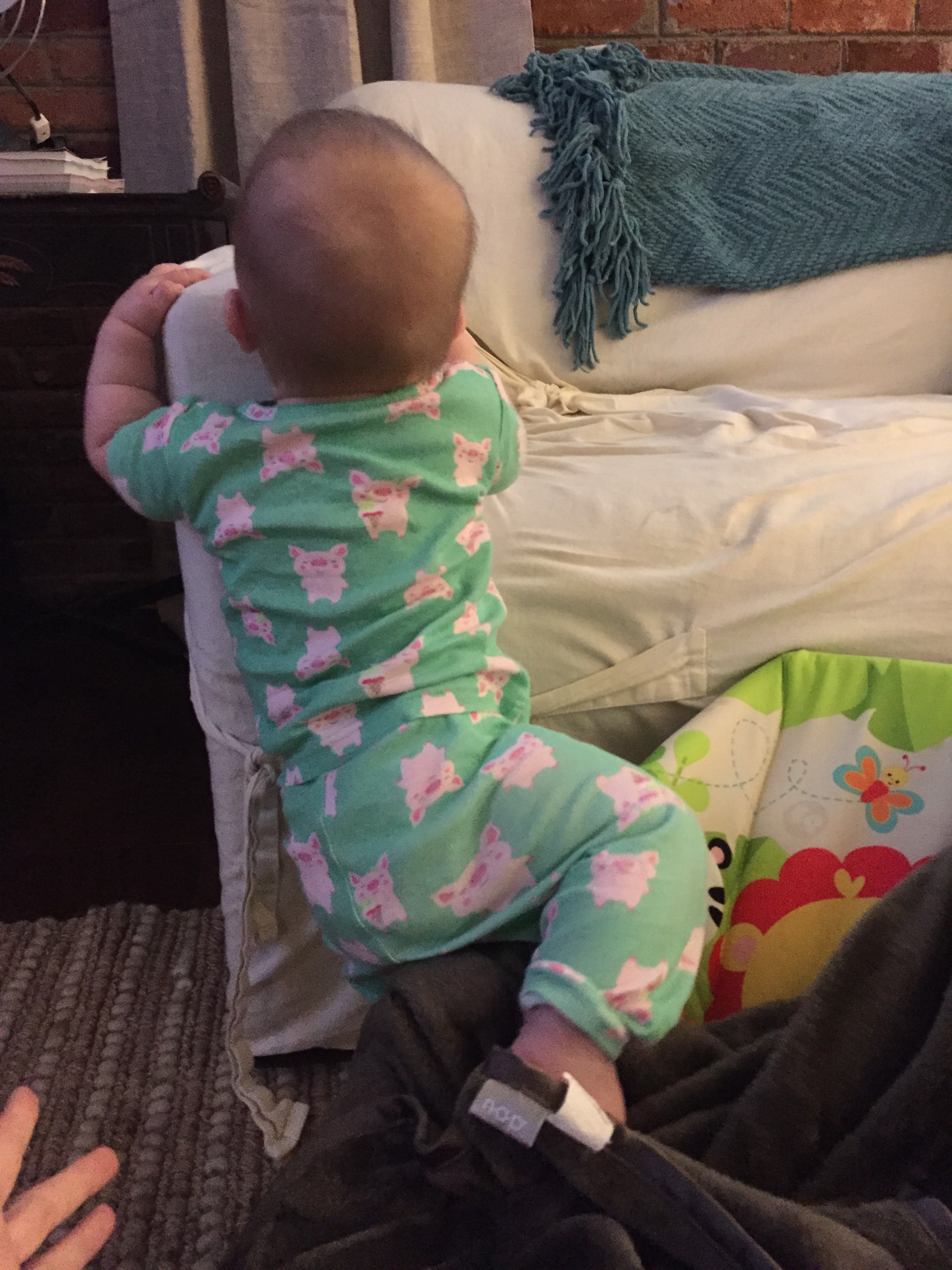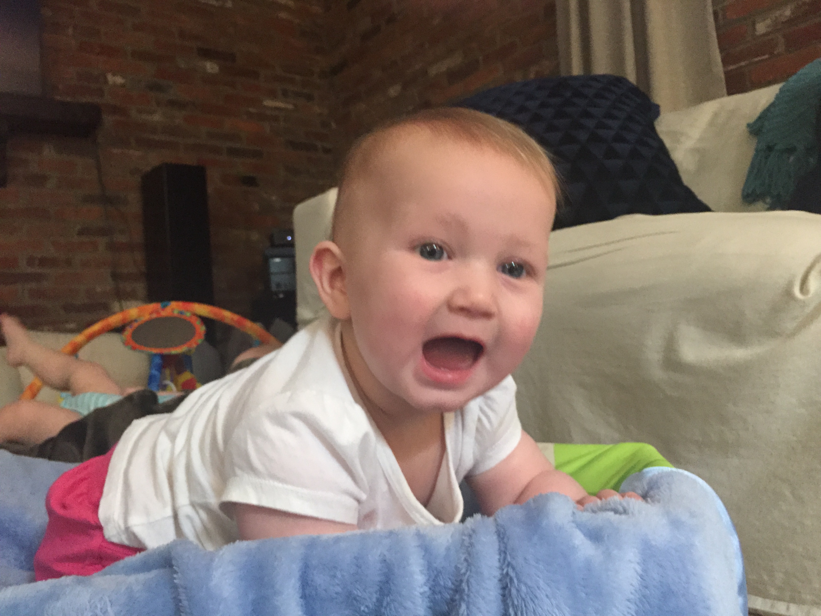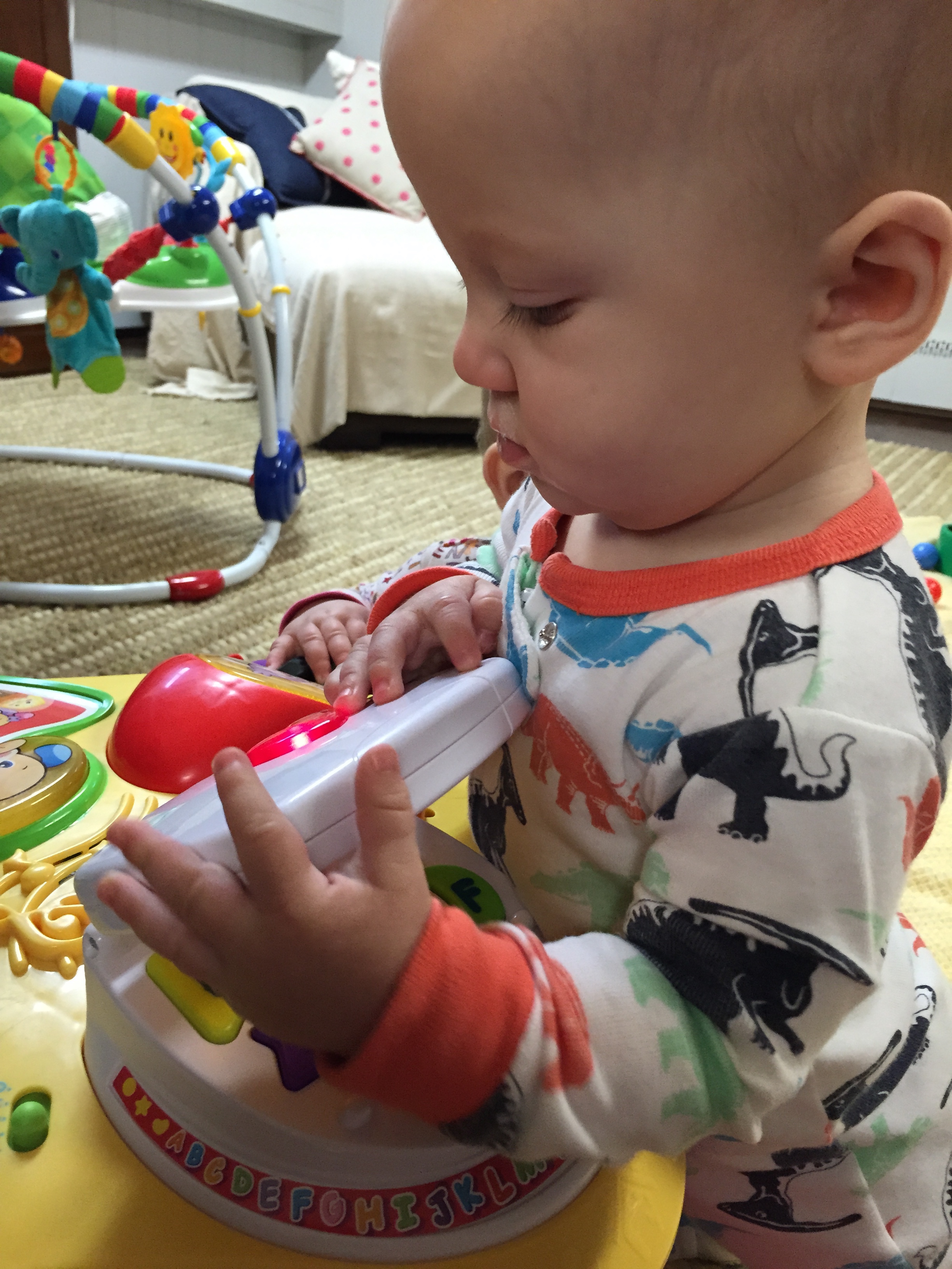 Liam is getting HUGE he started out smaller than his sissy (as we call her or Miss P) and we called him Benjamin Button for a while because he came out looking like an old man. His other nick name was grumpy gus…now a days he is a chunky monkey and happy little guy. Most days his sister is running all over him LITERALLY and he is happy to chill out and take in the scenery. His favorite things these days are: 1) solid food doesn’t matter what he loves to eat! 2) music 3) his sissy he loves to give her kisses as she is running over him 4) the dogs he enjoys chasing hem around the house in the “car” (walker) 5) and his momma he will be my boy for sure! 6) his “car” the walker. 7) Mickey Mouse Club. Here are a few recent pictures of him…