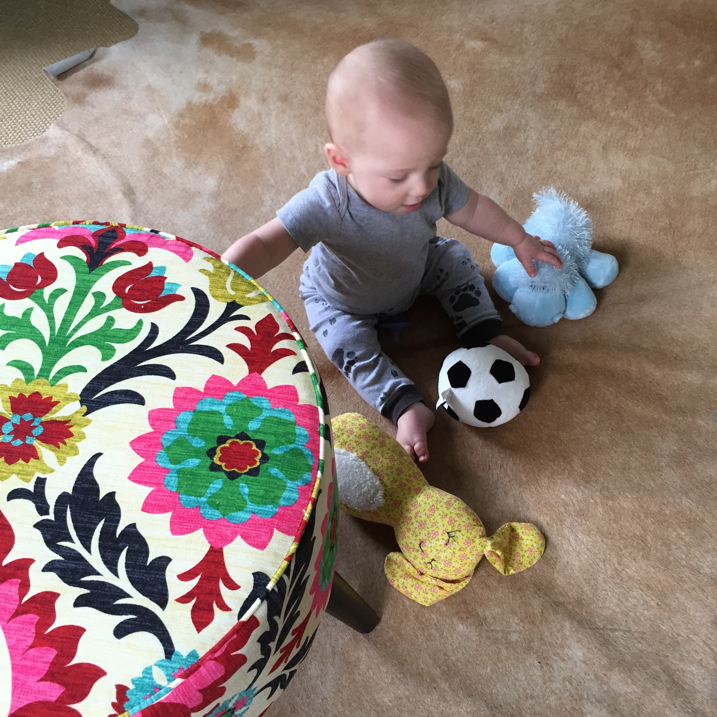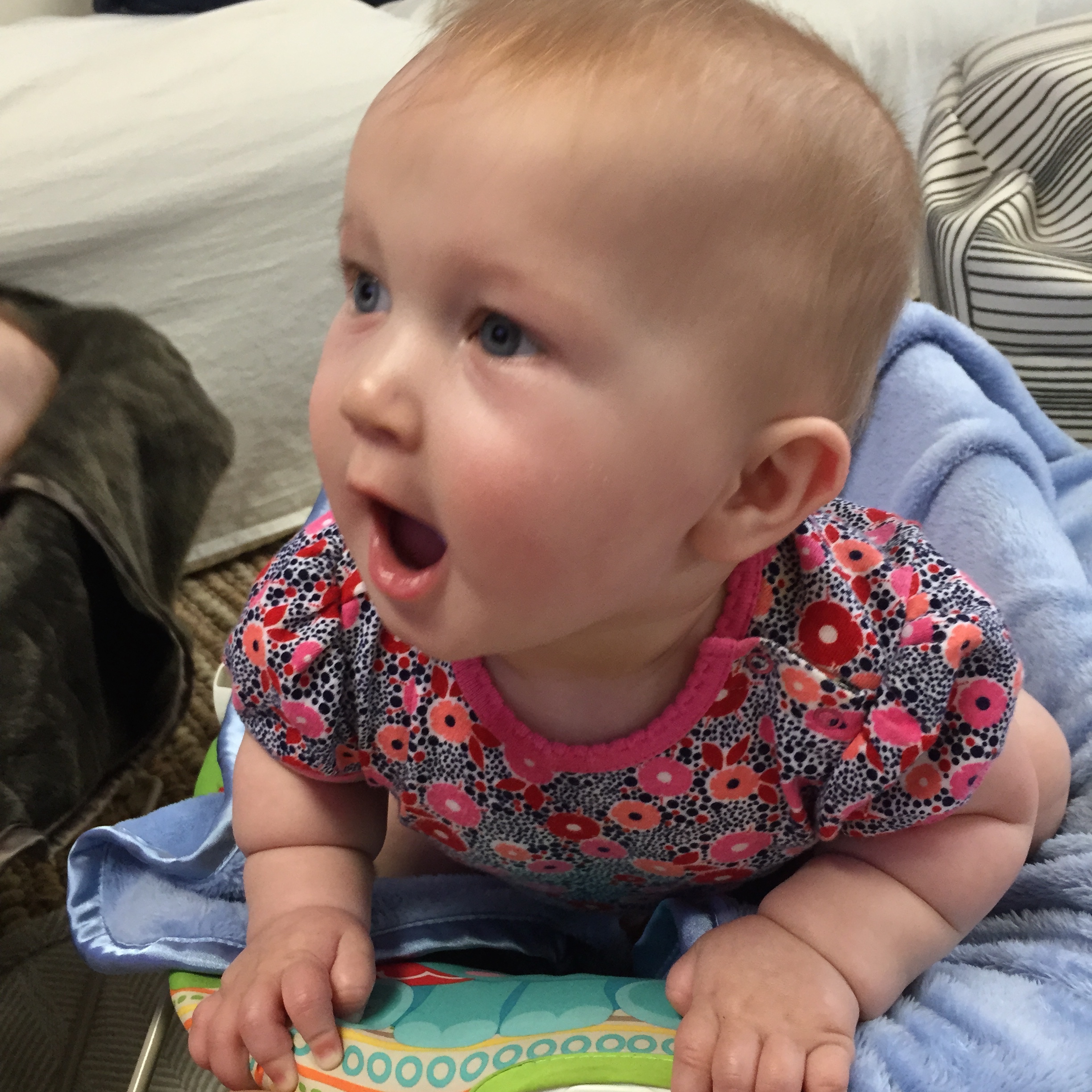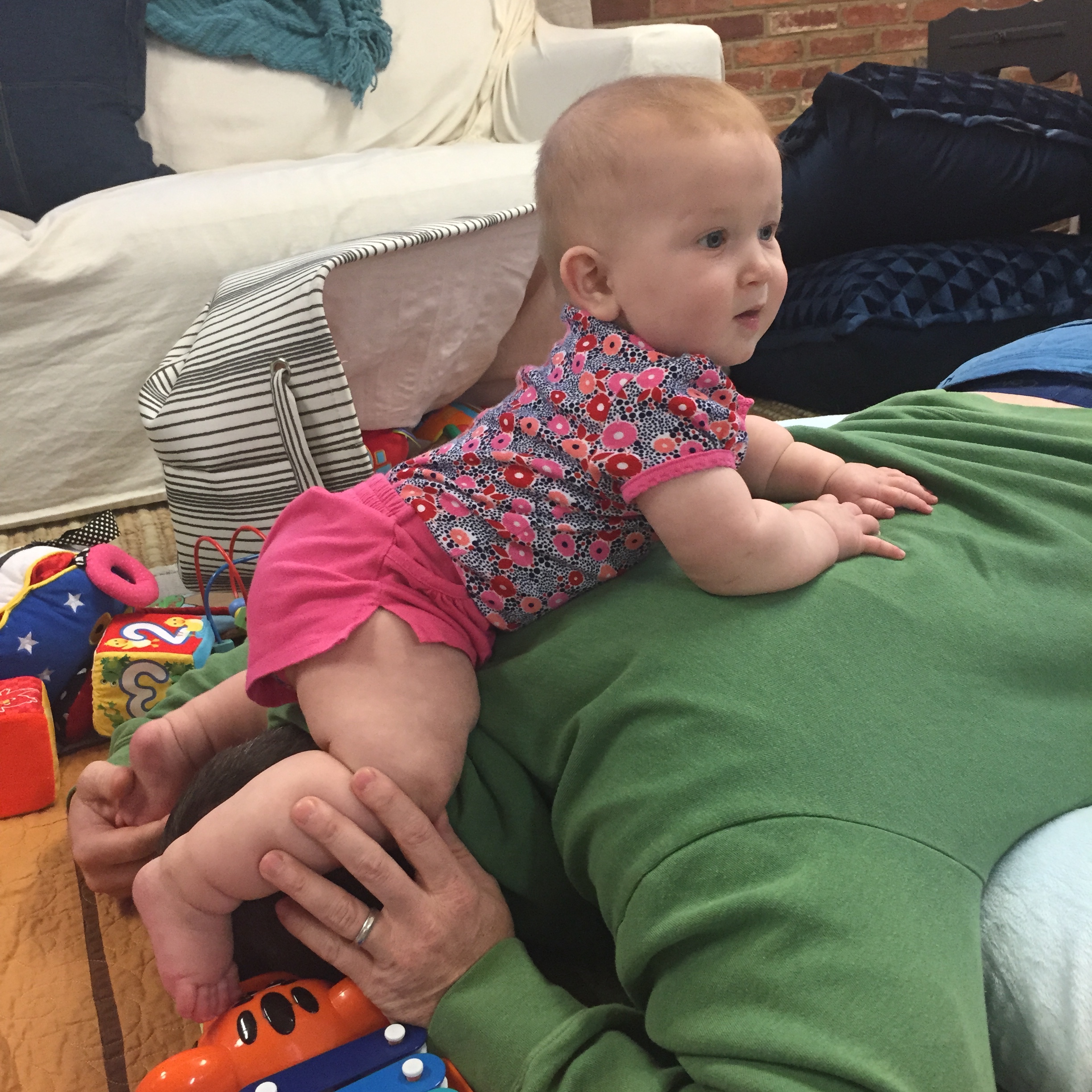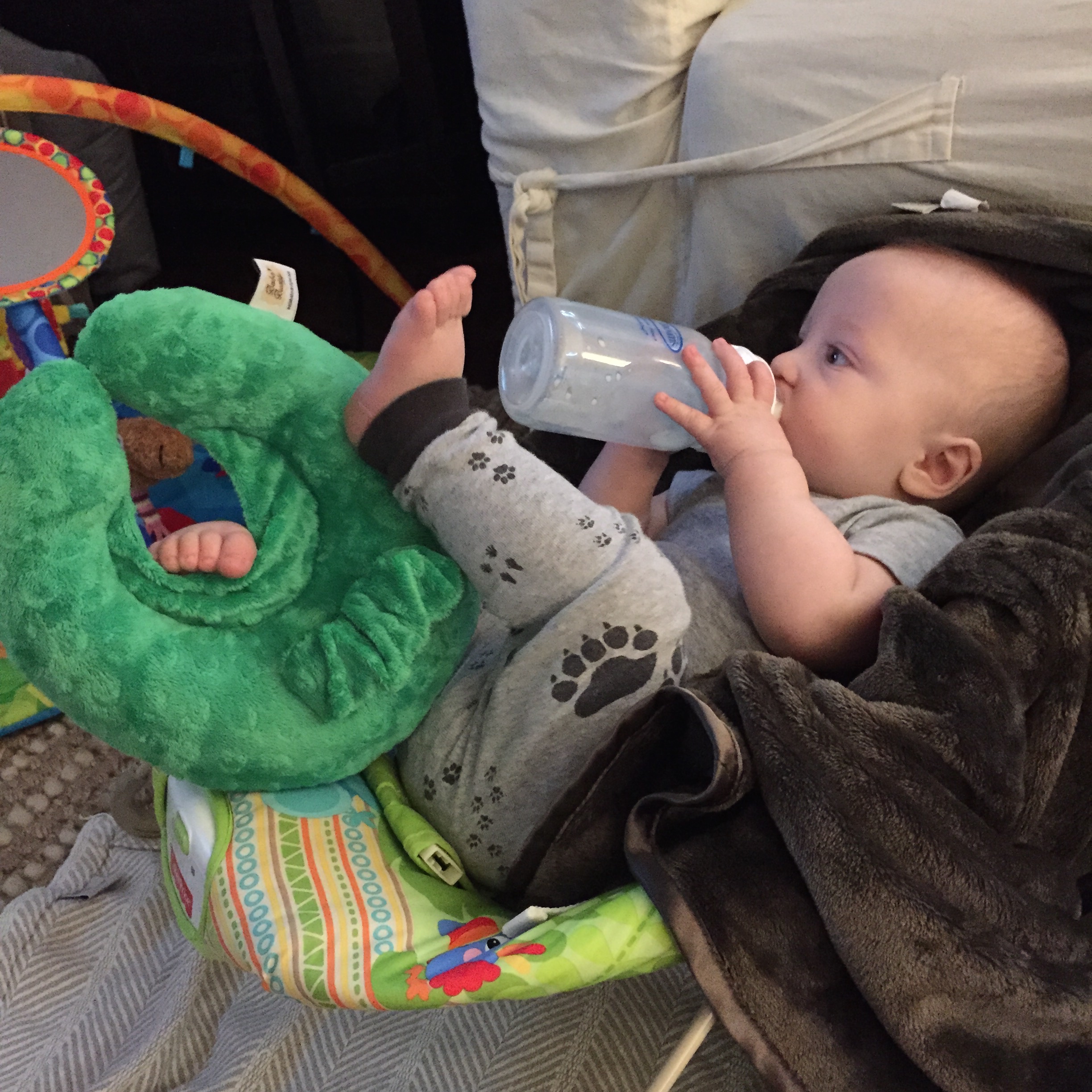 Liam is getting HUGE he started out smaller than his sissy (as we call her or Miss P) and we called him Benjamin Button for a while because he came out looking like an old man. His other nick name was grumpy gus…now a days he is a chunky monkey and happy little guy. Most days his sister is running all over him LITERALLY and he is happy to chill out and take in the scenery. His favorite things these days are: 1) solid food doesn’t matter what he loves to eat! 2) music 3) his sissy he loves to give her kisses as she is running over him 4) the dogs he enjoys chasing hem around the house in the “car” (walker) 5) and his momma he will be my boy for sure! 6) his “car” the walker. 7) Mickey Mouse Club. Here are a few recent pictures of him…