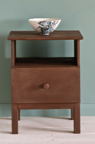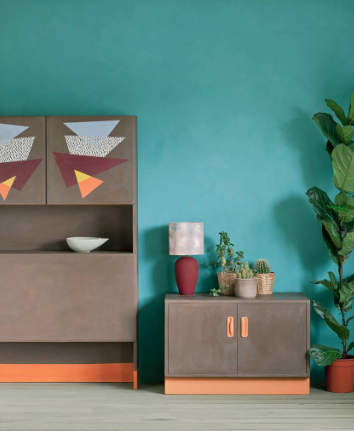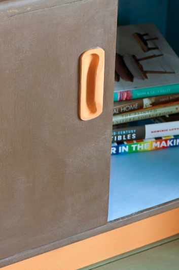Below.. The mid-century interiors were Annie’s inspiration for this room. Everything in these pictures above has been painted in Chalk Paint®, even the lampshade was dyed in it! The walls were painted in Provence and the cupboard was painted in Honfleur.