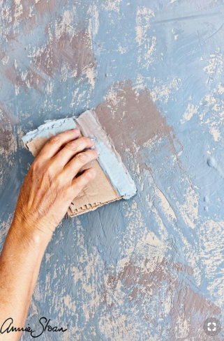 These pictures were posted by Annie Sloan on her Pinterest page. Annie Sloan is one of our favorite designers. All her Paints are waterbased and super easy to use! Annie created this rough and luxurious wall using five different Chalk Paint® colors to give depth and interest. Annie started by painting this wall all over with Old Ochre. Next, she poured equal amounts of Duck Egg Blue and Louis Blue onto a Mixmat™ and mixed the colors roughly using a cardboard applicator.