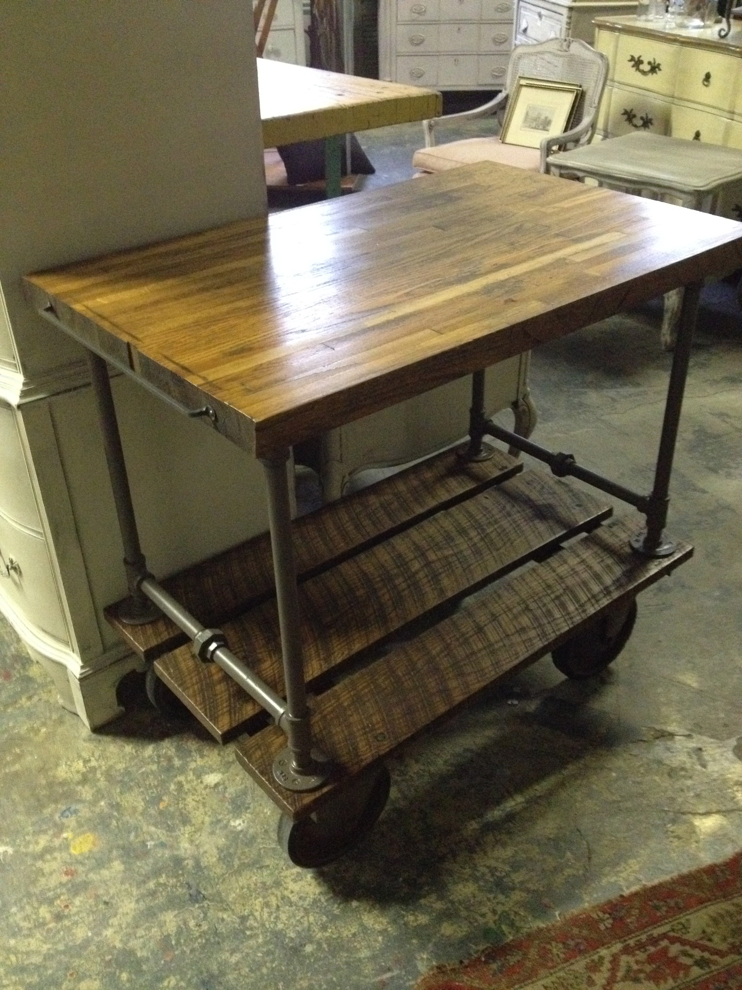 We have some new industrial rustic pieces that I am in LOVE with…. these are all made by hand locally and most are on wheels (yippee!).